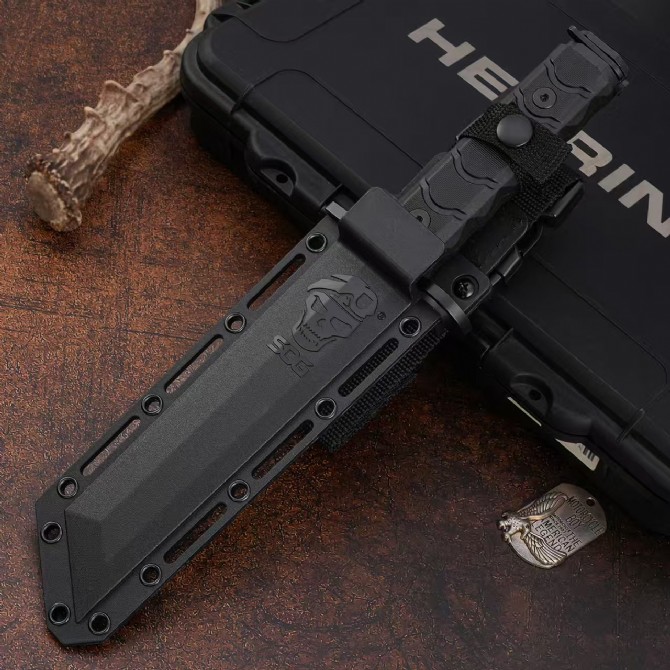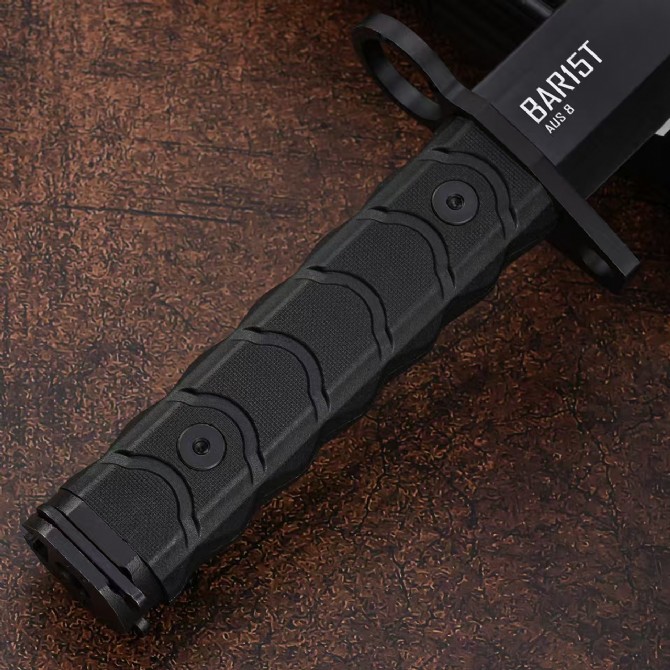 The 4.8-inch handle includes a straight guard and an integrated mounting system that allows the knife to be attached as an AR-15 bayonet. The main grip is made from black engineered polymer, featuring curved grooves along the top surface and angled pyramid-style texturing on the sides for improved control.